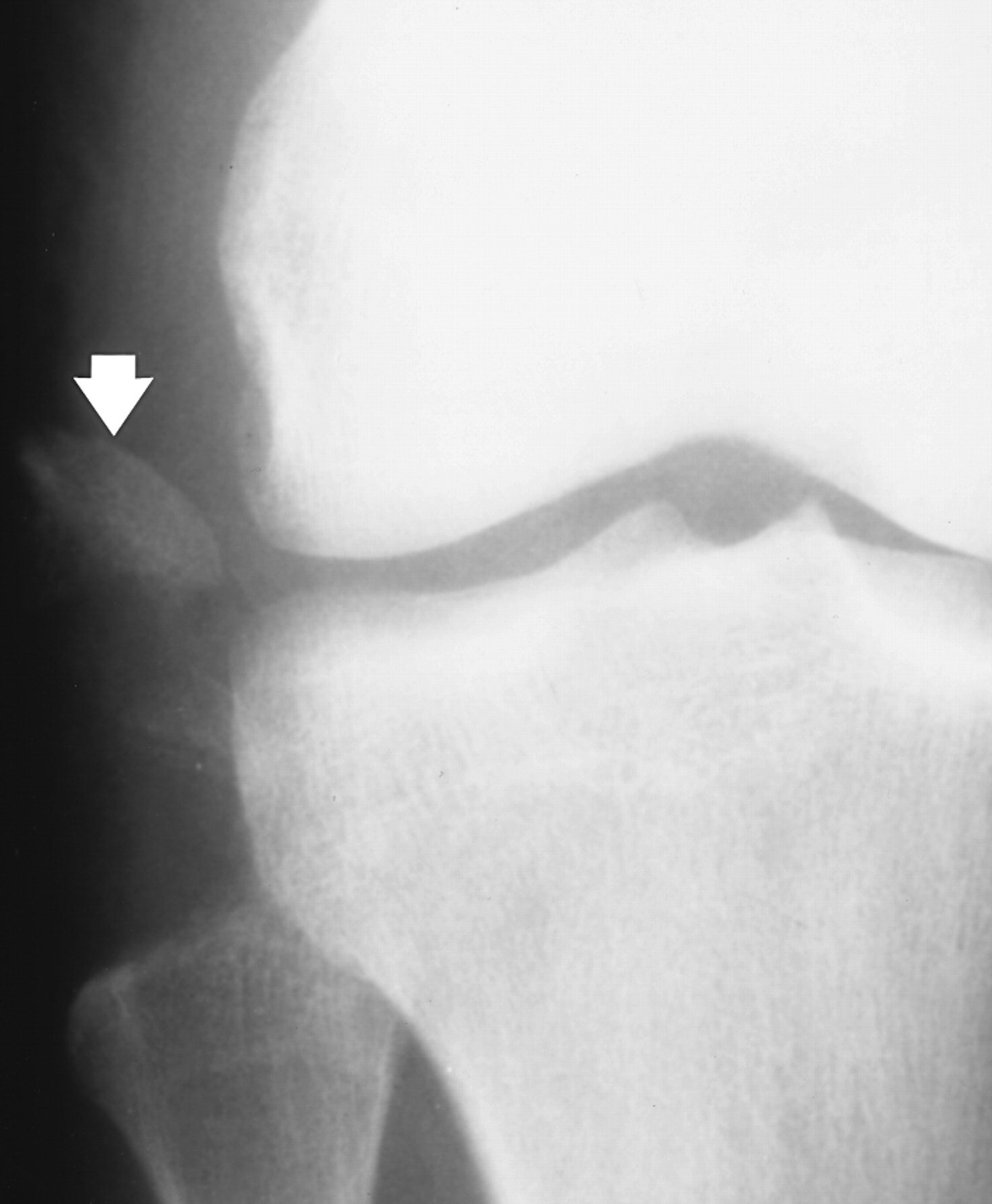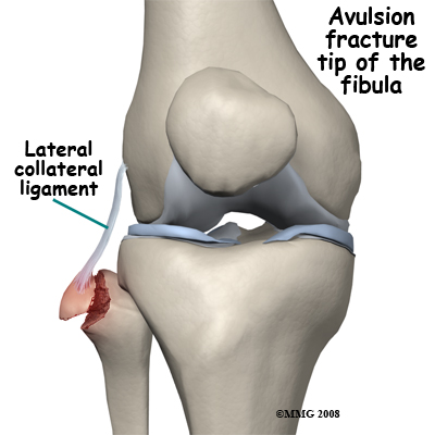Avulsion fractures are common and easily missed. This may involve the lateral epicondyle, a Segond capsular avulsion or occasionally there is a tell tale avulsion of the tip of the fibular head indicating distraction of the lateral ligaments, this is termed the "Arcuate sign".